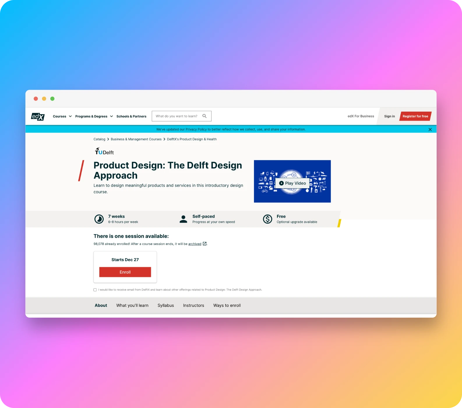 Using the Delft Design Approach, you will learn to use several essential design methods to create meaningful products and services. Follow this course on EdX.