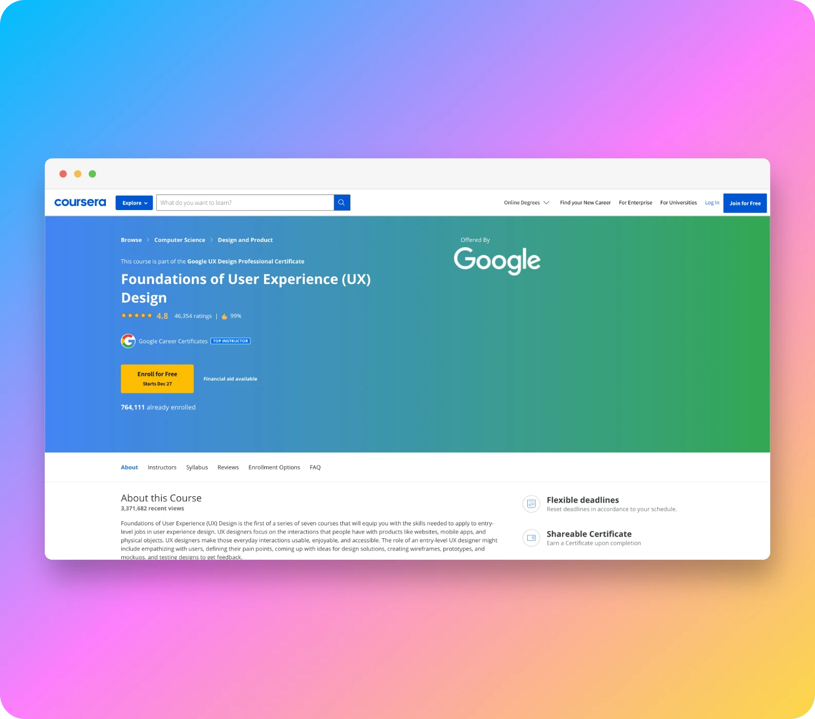 Foundations of User Experience (UX) Design is the first of seven courses to equip you with the skills needed to apply to entry-level jobs in user experience design. UX designers focus on people's interactions with products like websites, mobile apps, and physical objects. Start learning the course for free on Coursera.